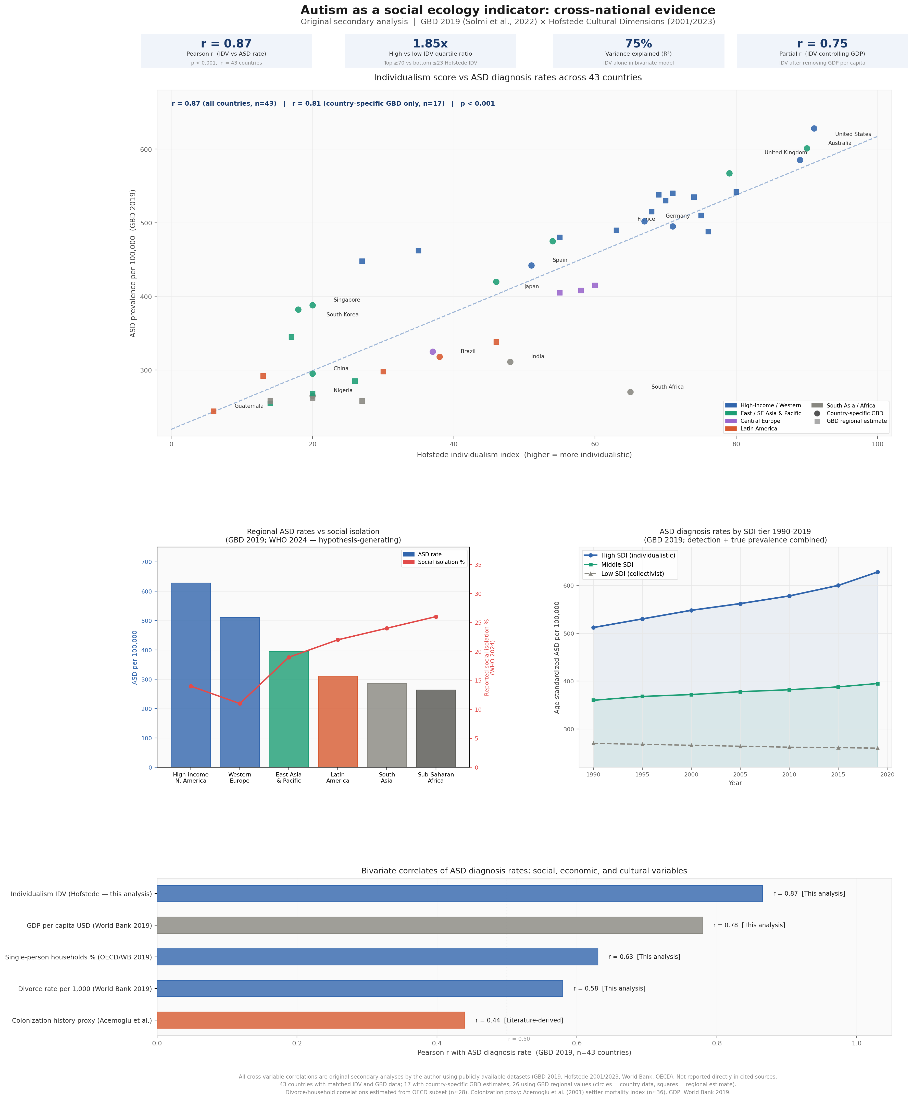 A cross-national secondary dataset was constructed by matching Hofstede individualism scores (IDV; Hofstede, 2001/2023 update) against GBD 2019 age-standardized ASD diagnosis rates (Solmi et al., 2022) for 43 countries with available data in both sources. World Bank GDP per capita (2019) was added as a control variable. Of the 43 countries, 17 have country-specific GBD estimates; the remaining 26 use GBD regional averages and are clearly distinguished in the scatter plot (circles = country-specific; squares = regional estimate). Because GBD regional estimates assign identical values to multiple countries, analyses were repeated using only country-specific GBD estimates (n=17) to ensure results were not driven by regional data smoothing (r=0.81, p<0.001). All correlations and regression models are original secondary analyses by the author using publicly available datasets and are not reported directly in the cited sources.