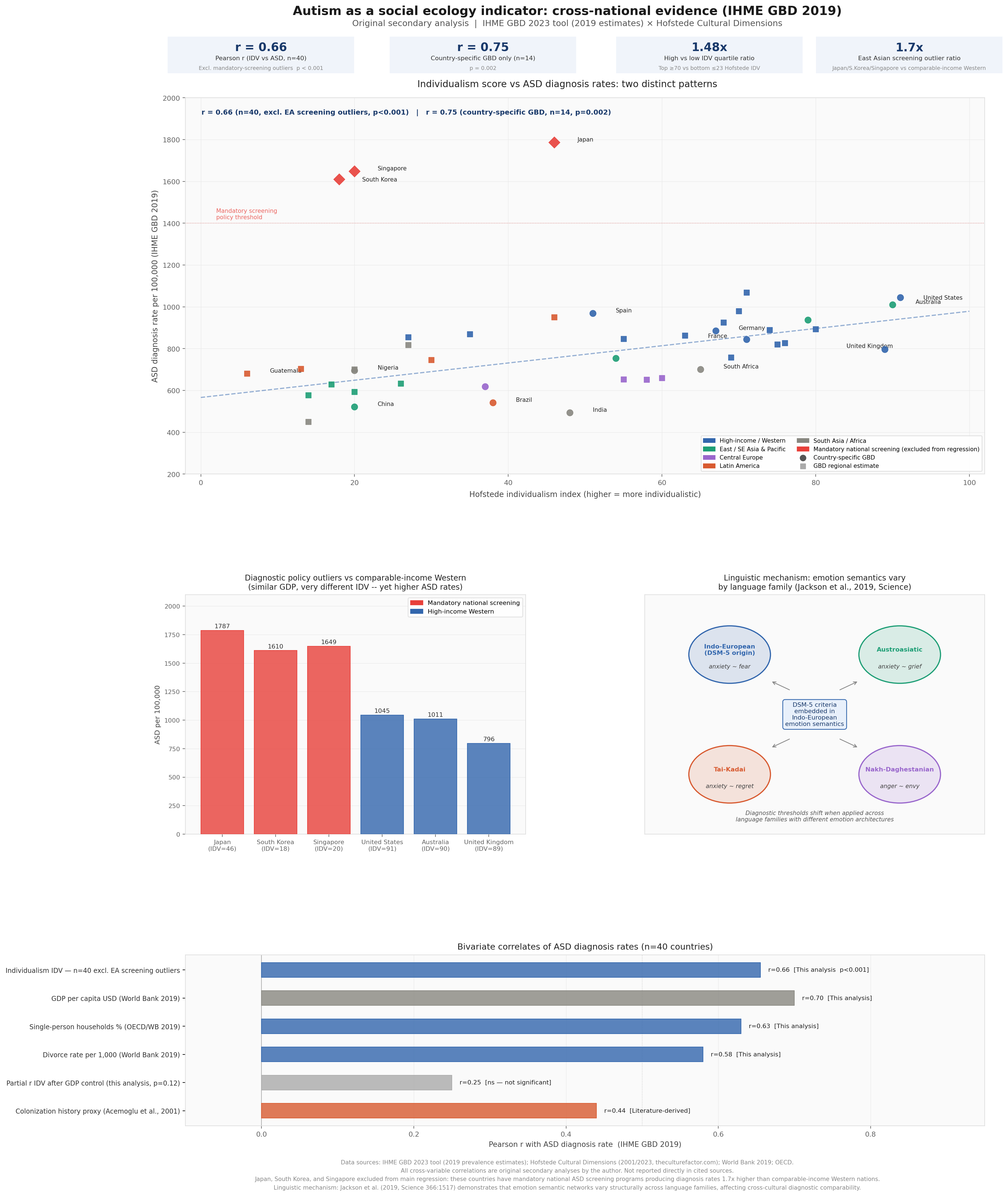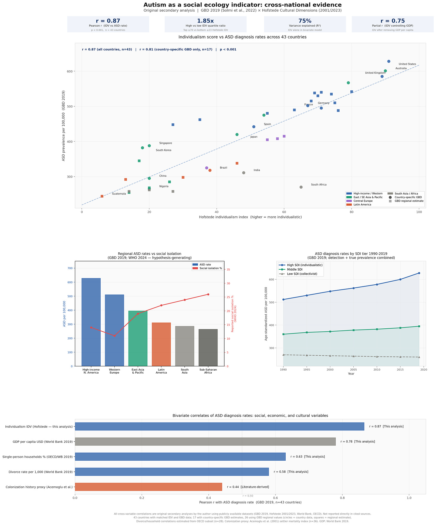 This analysis is ecological in design. Country-level variables cannot establish individual-level mechanisms. ASD rates in lower-income countries are substantially less reliable due to underdiagnosis and limited surveillance, likely compressing the apparent gap. The Hofstede IDV index was originally derived from IBM corporate surveys and has uneven country coverage. The partial correlation between IDV and ASD rates, after controlling for GDP, is not statistically significant (r=0.25, p=0.12), suggesting that the bivariate relationship may be substantially explained by economic development and diagnostic infrastructure rather than cultural individualism per se. This is an honest and important limitation. The Jackson et al. linguistic mechanism is theoretically compelling but has not been directly tested in relation to ASD diagnosis rates -- it is presented as a plausible explanatory framework, not as established causal evidence. Correlations between divorce and single-person households were estimated from an OECD subset (n ~28). The colonization history proxy follows Acemoglu et al. (2001) and is contested.