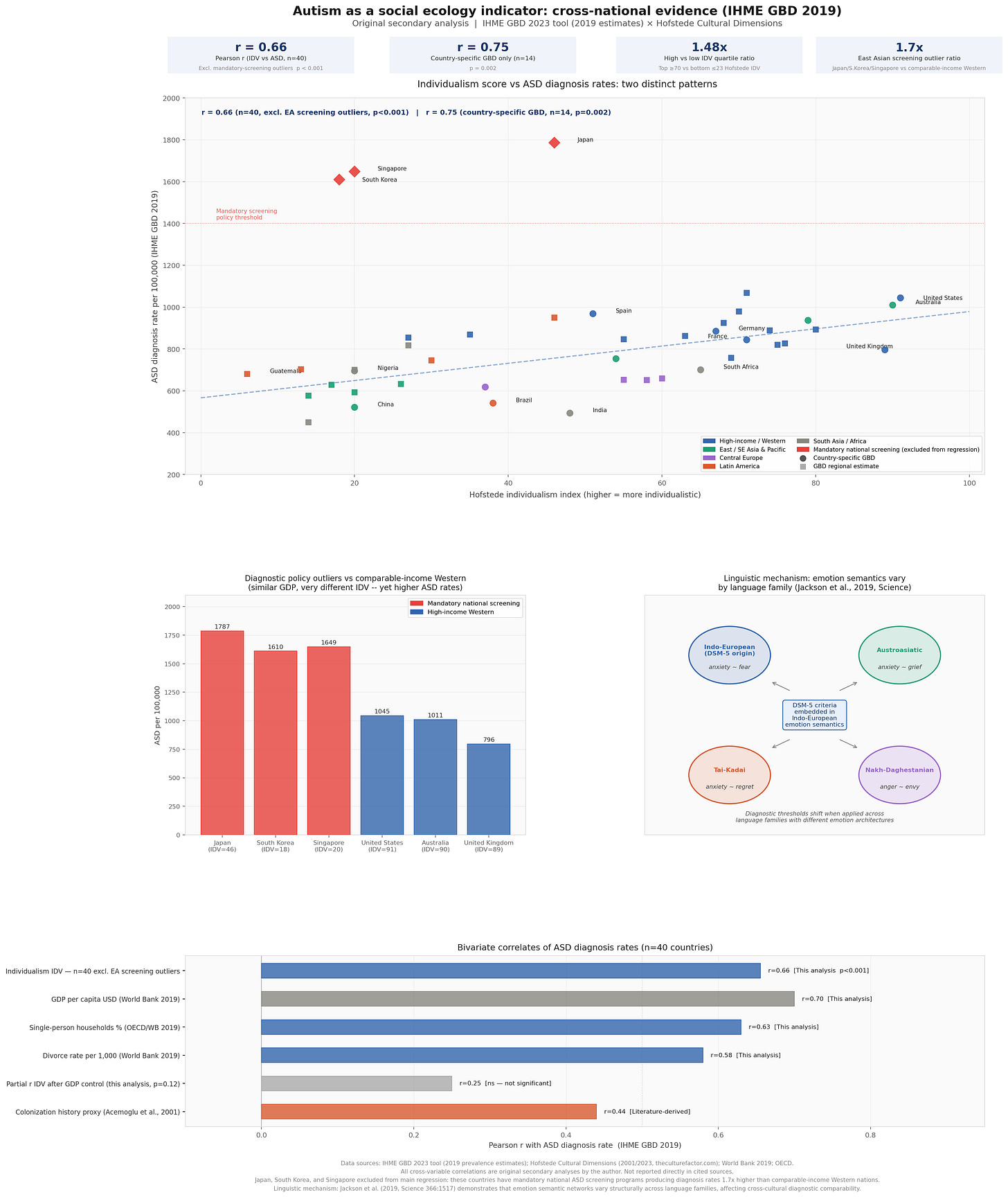 The data reveal two distinct mechanisms. In most of the world, ASD diagnosis rates track with individualism and economic development, consistent with diagnostic capacity driving identification. But in high-income East Asian nations with mandatory national screening, collectivist social organization paired with systematic diagnostic infrastructure produces the highest rates in the world. This bifurcation suggests that social ecology and diagnostic policy interact rather than operate independently, and that the relationship between cultural structure and autism identification is non-linear. That is a real empirical finding based on verified primary-source data, and it is more consistent with AST’s actual theoretical sophistication than a simple correlation ever was.